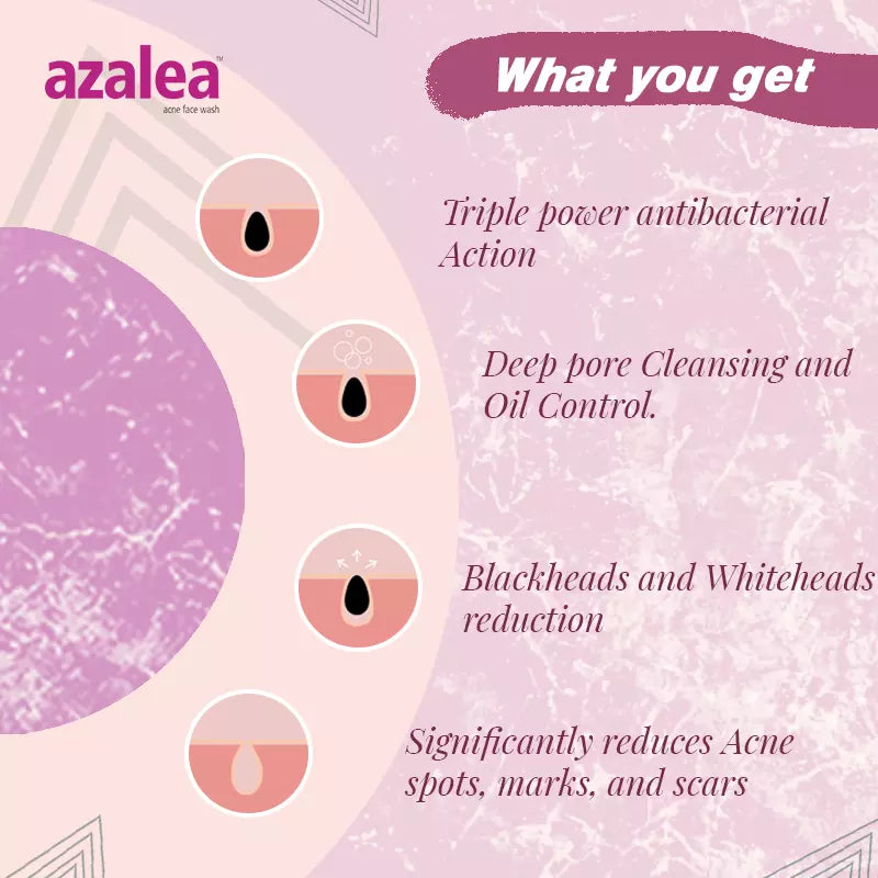 Azalea Acne Face Wash exfoliates the comedones, removes dead skin cells to unclog the pores, and curbs the growth of P. acnes preventing acne breakouts. The deep cleansing action of Azalea Face Wash removes excess oil from the facial skin without drying it out. It is well tolerated and safe for sensitive, oily, and acne-prone skin even with daily use.
